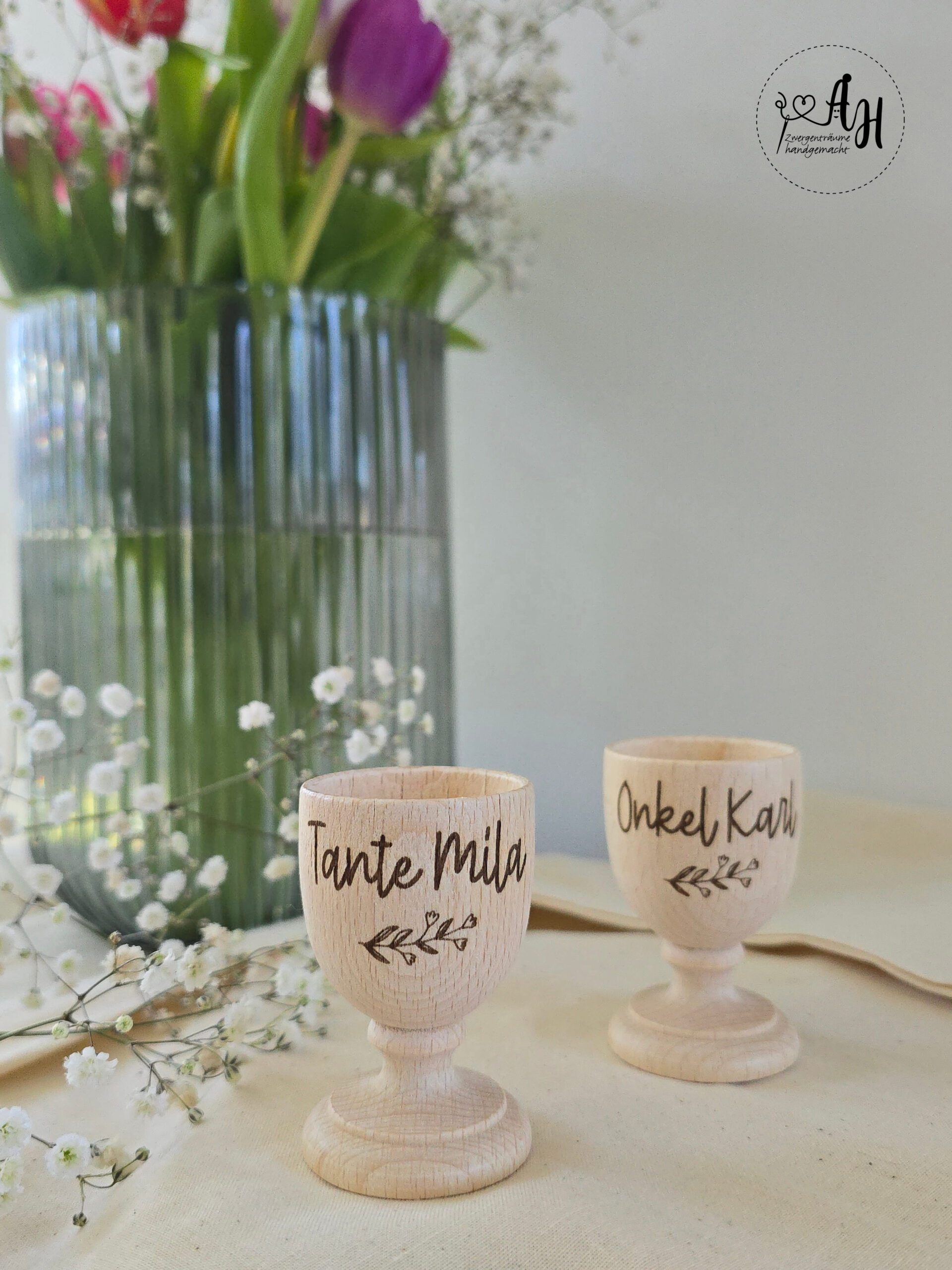 ♥ Dieser hochwertige Eierbecher aus Holz wird individuell für dich personalisiert und ist ein ganz besonderes Highlight auf dem Frühstückstisch. Ob für Oma, Opa, Mama, Papa, Kinder oder die ganze Familie – mit deinem Wunschnamen entsteht ein liebevolles Unikat.